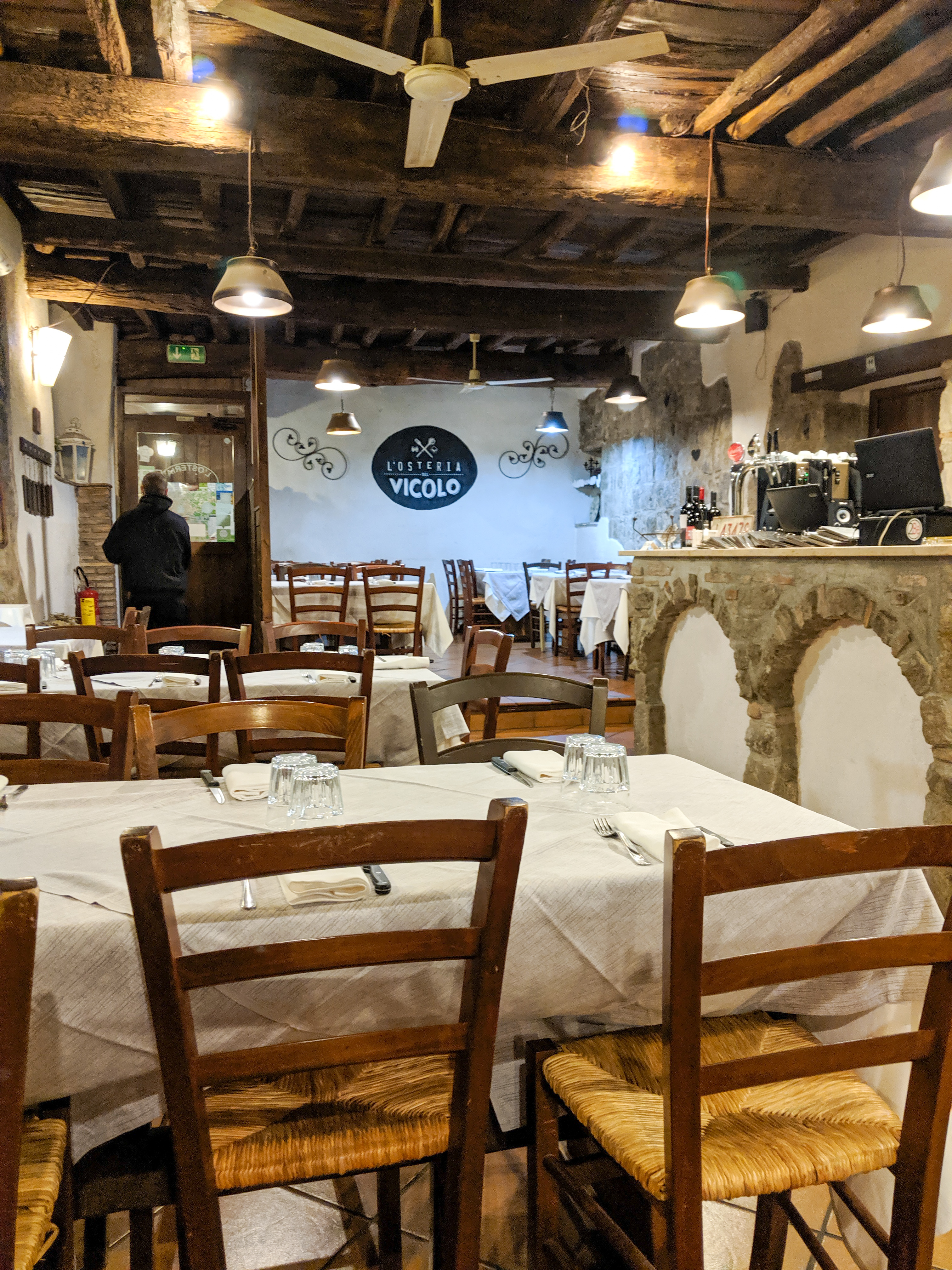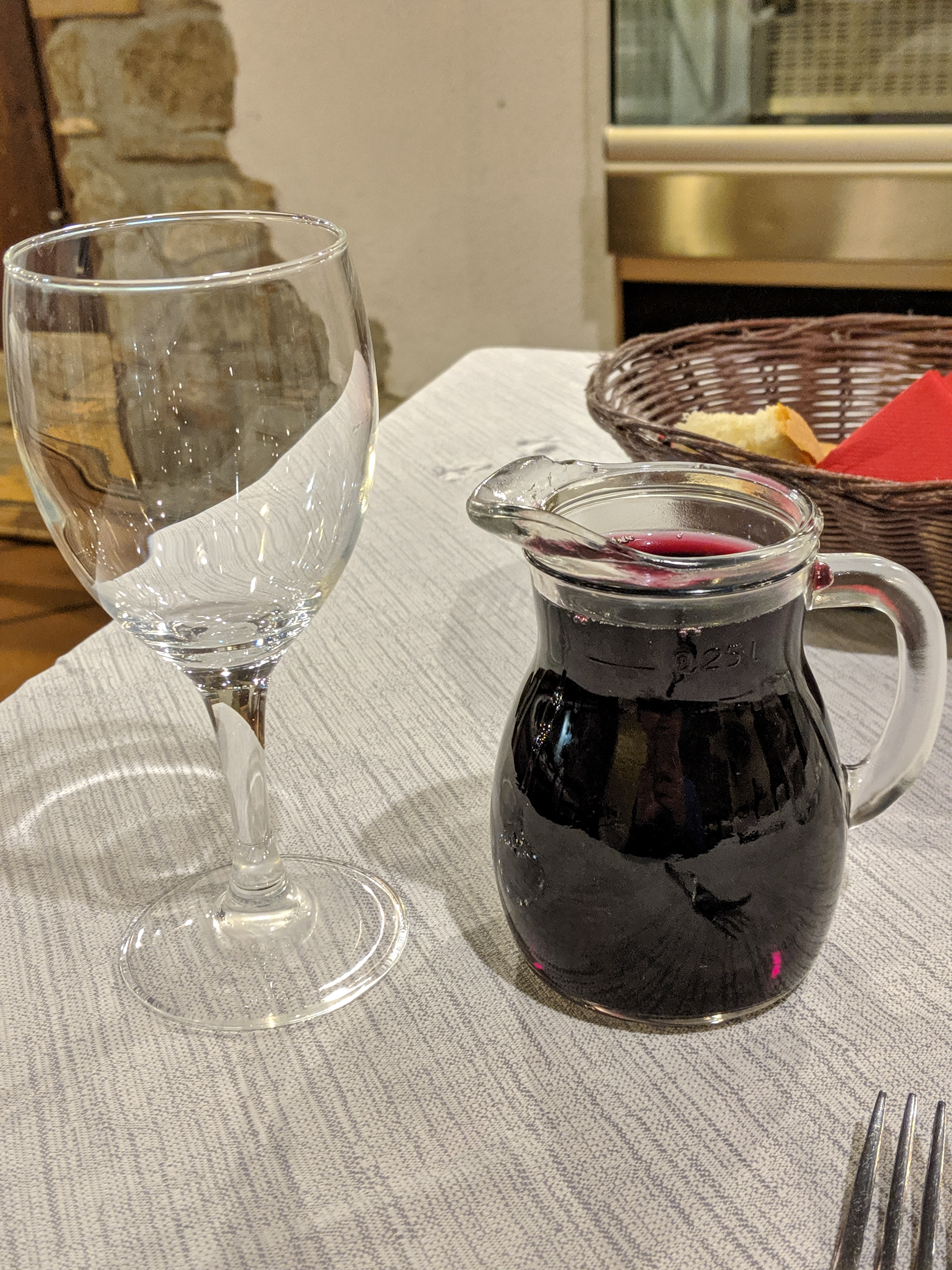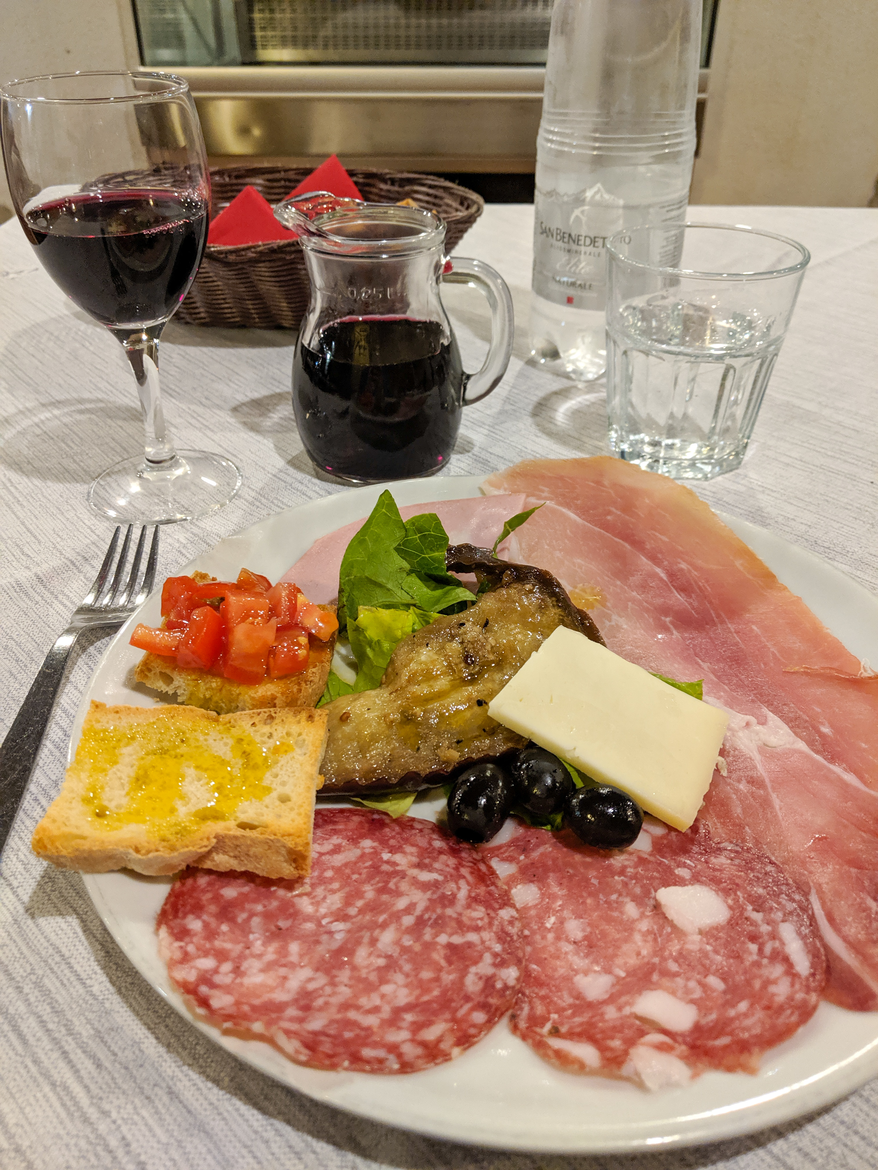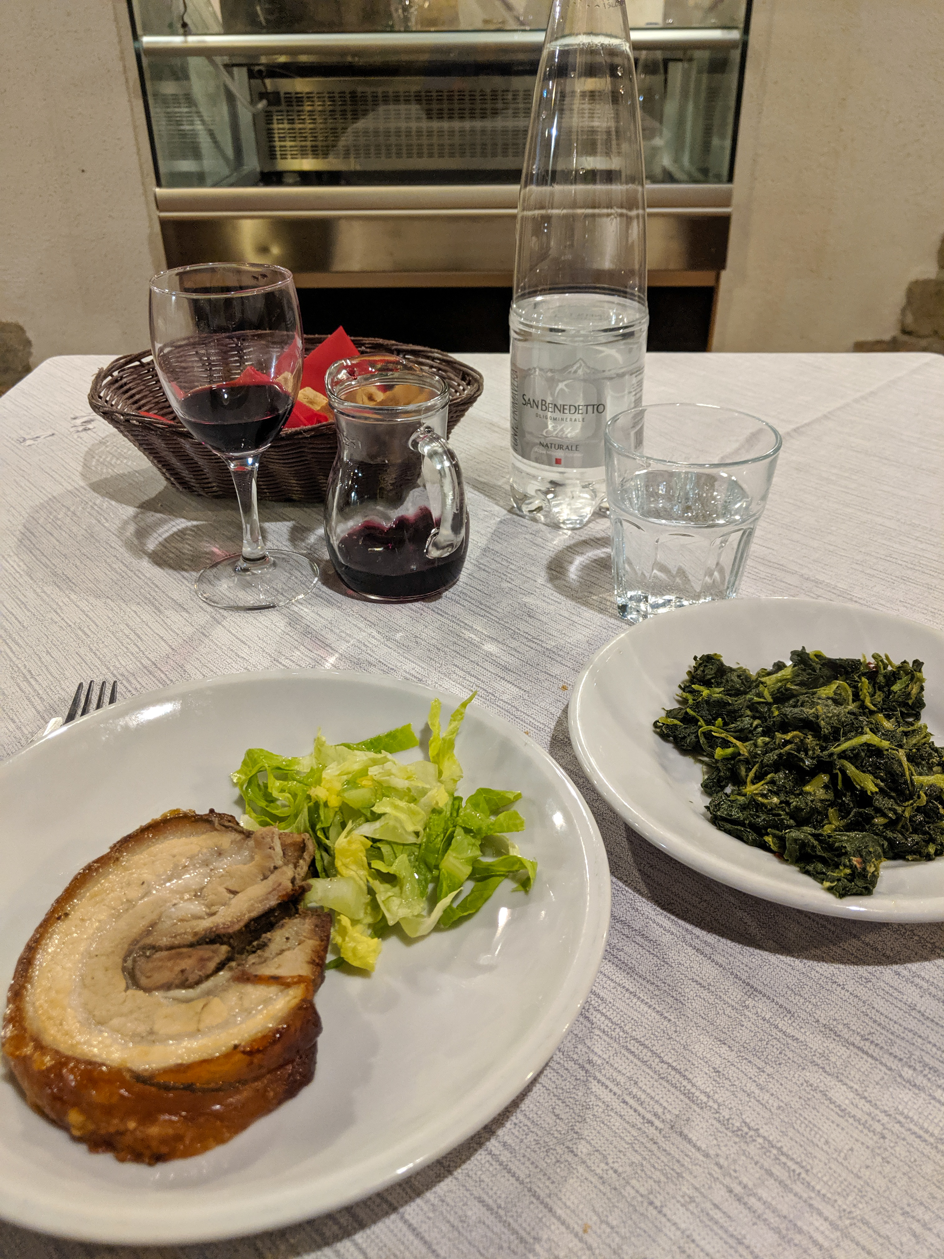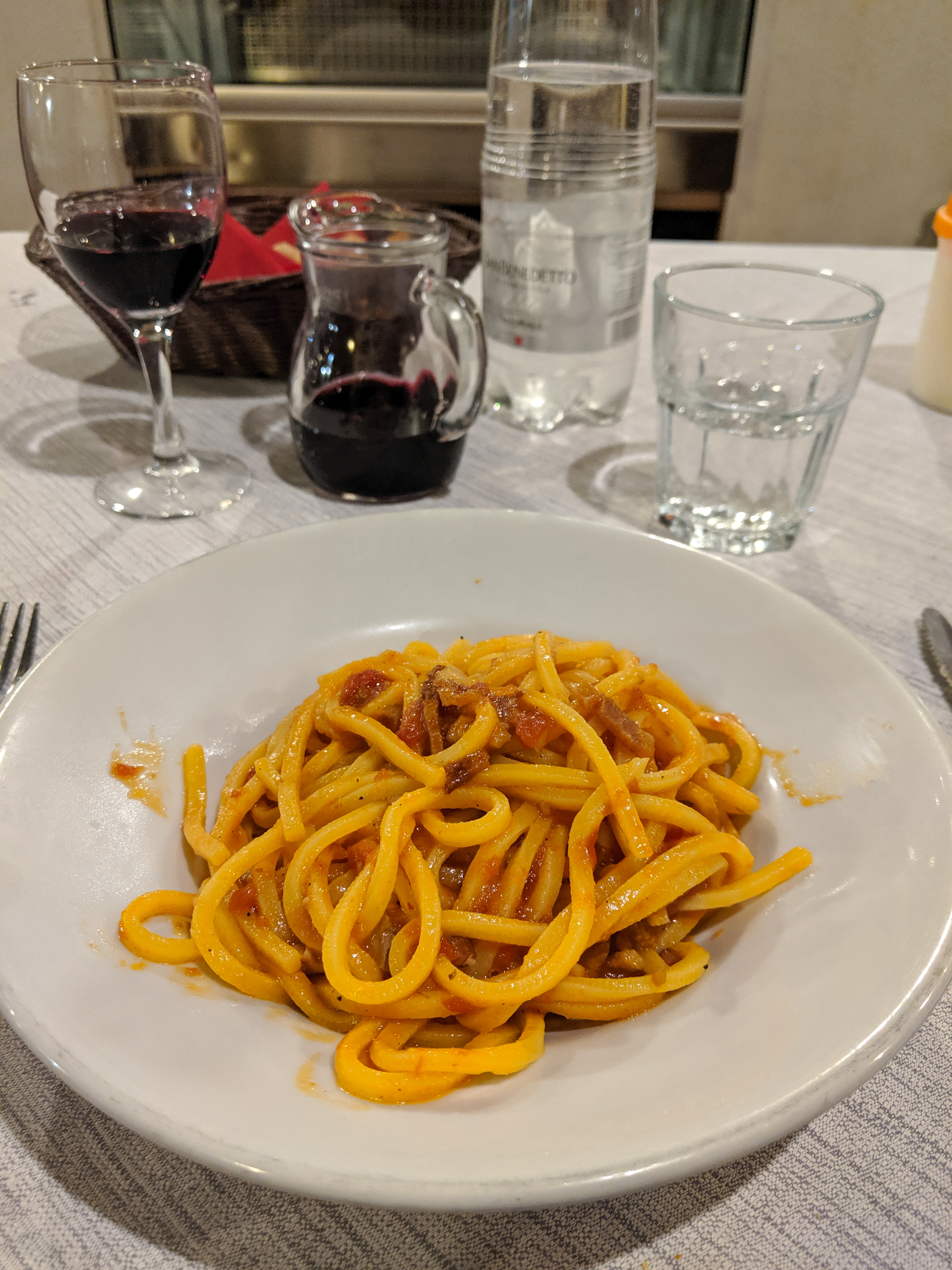 Viterbo is an ancient city that I think is best known for housing the papal palace for a time in the 1200s. The city has some really interesting maze like cobble stone streets that were fun to explore. I may explore the city some more tomorrow morning if I have time. I had dinner at the restaurant directly next door to the Airbnb and my laziness in restaurant choice paid off. A 3 course meal including antipasti, pasta Amatriciana, porchetta, a side of broccoli and 0.25L of wine came to €18 and was the best meal I’ve had on this trip so far. The restaurant opened at 7:30 which was right when I arrived. This was great because with no one else there the waiter was nice enough to translate the entire menu for me.
