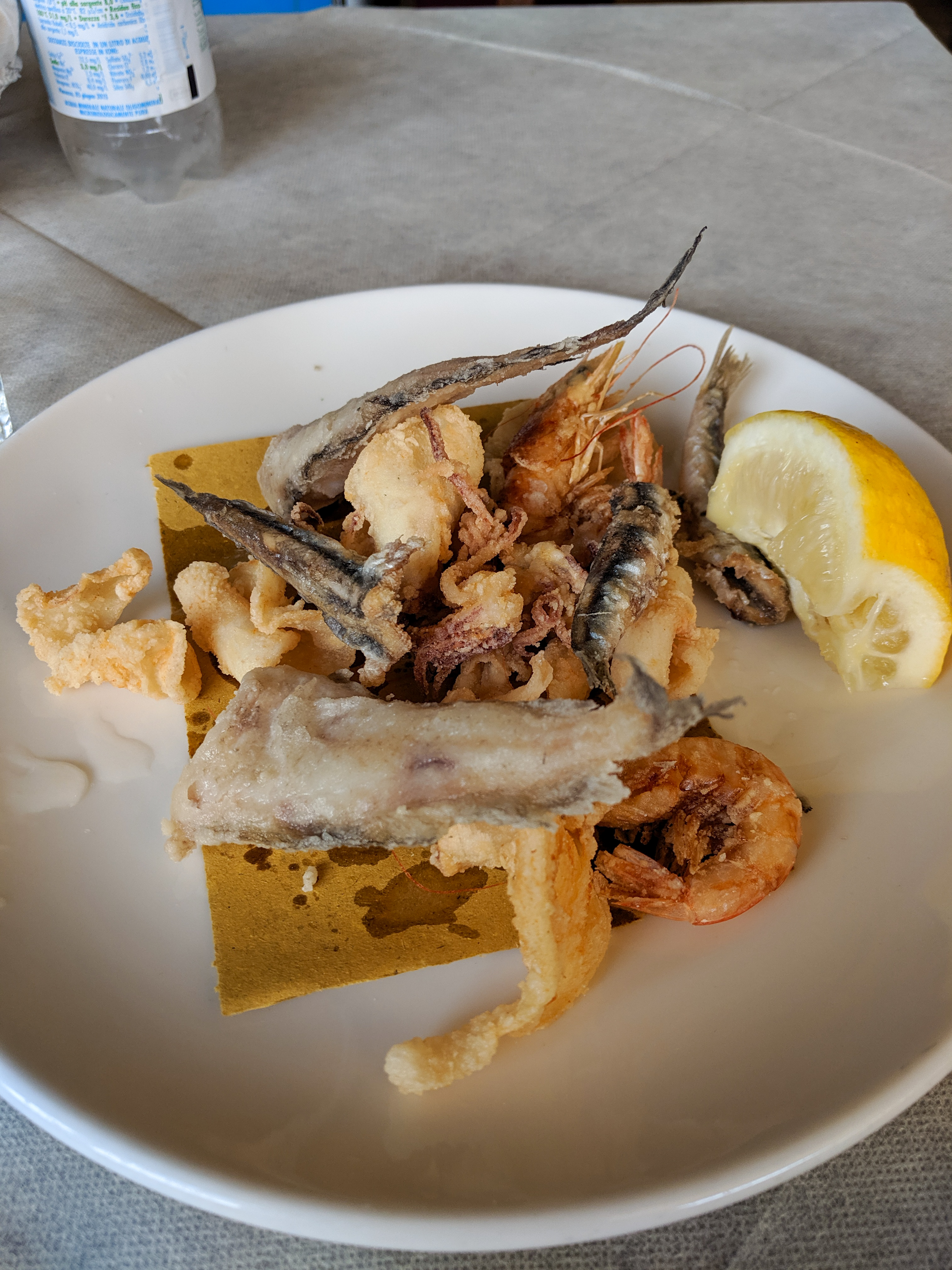 After a little more than 20 miles I decided to stop for lunch and found a great restaurant just north of Massa. The sign said it was a €12 “working lunch” which turned out to be a 2 course meal with a drink included and no coperto (the normal fee added to a bill). The menu was mostly seafood, and I trusted it was fresh given I was sitting a few feet from the Tyrrhenian Sea. I started with a shrimp risotto and followed that with a mixed plate of fried fish. Both were excellent.