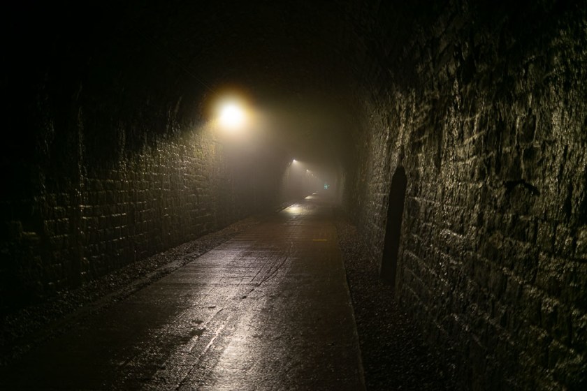 At one point I spotted a rather large hill ahead of me and was not looking forward to climbing it. While looking up the hill for the switchbacks I knew were to come, I instead arrived at a small tunnel which went straight through the hill. I entered the tunnel and the temperature easily dropped 20 degrees. The tunnel was almost 0.75 miles long which meant I couldn’t see the other side and had to rely on the creepy lighting to get through. The tunnel trended uphill, but it was much nicer than having to climb several hundred feet of elevation.
