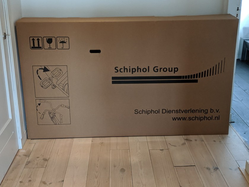 I left the store and did some more research and found out that they sell bicycle boxes at the airport. At this point I was so frustrated with wasting the day walking around in search of a box that I decided to hop on the train to the Airport. It only took 20 minutes to get there and I was easily able to find the location to purchase a box. I probably could have just ridden my bike to the airport and boxed it up when I leave on Wednesday. I really didn’t want to worry about taking my bike apart in the airport or having to deal with a scenario where the airport didn’t have any boxes available. Once I got the box, I bought a train ticket to get back to Amsterdam and got on the train. The box is large, but the train was fairly empty, and I wasn’t blocking anyone or the entrances. Of course, as soon as the train was ready to leave, I was kicked off by one of the conductors. He said I wasn’t allowed to bring something that large on the train. I had purchased my train ticket from a ticket counter, and the salesperson saw me with the large box. I don’t understand why they would sell me a ticket if I wasn’t allowed to bring the box on the train.